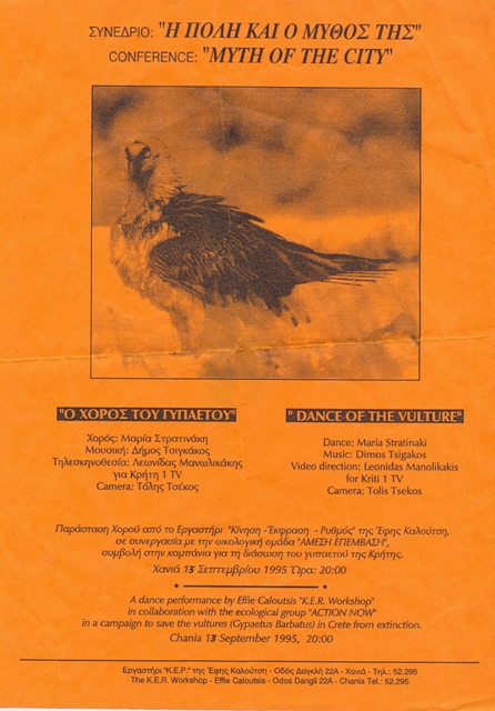 During the 'Myth of the City' conference in Crete, 1995, participants visited the dance studio of Effie Caloutsi to see a dance performance by the K.E.R. Workshop called: