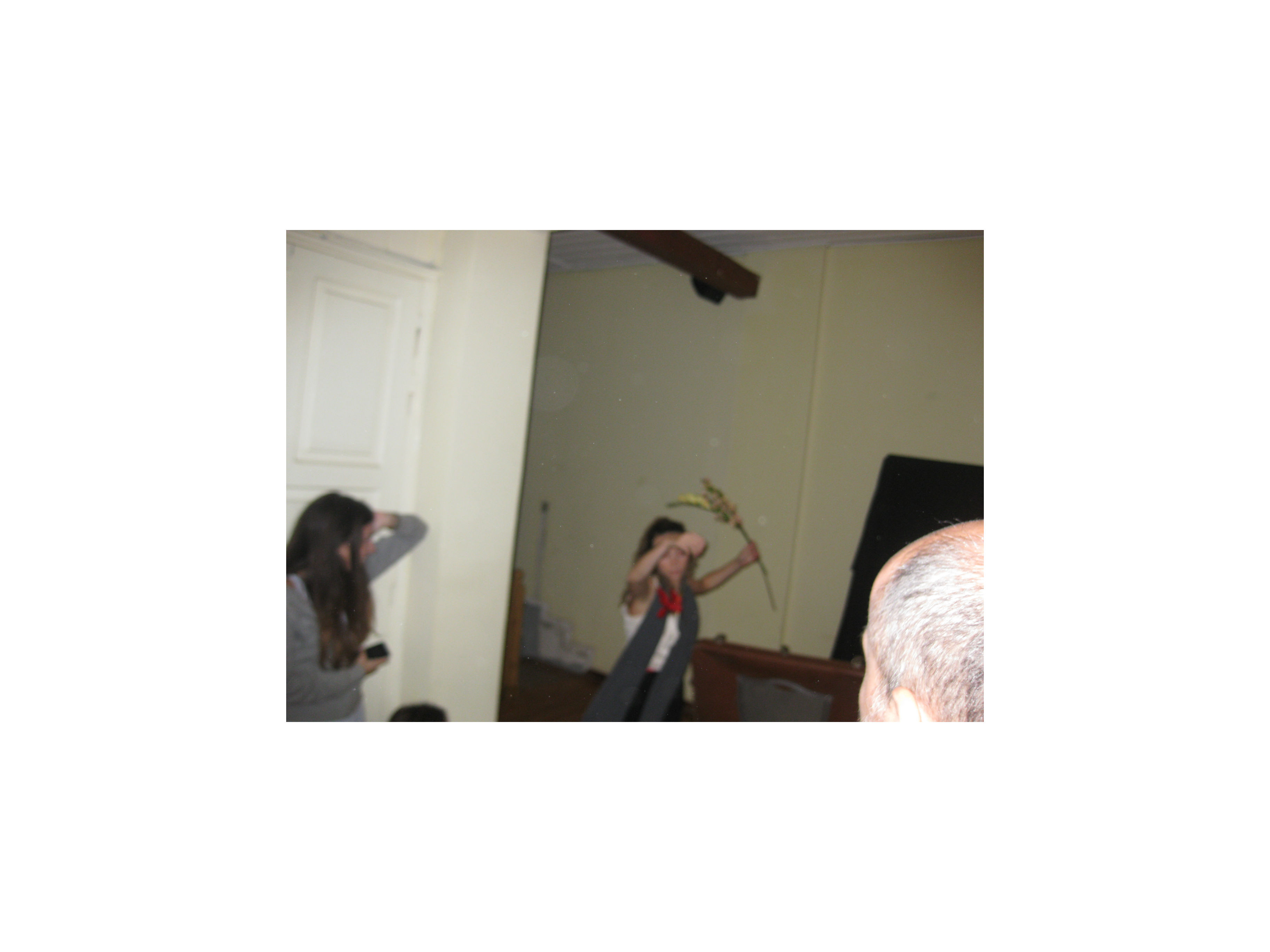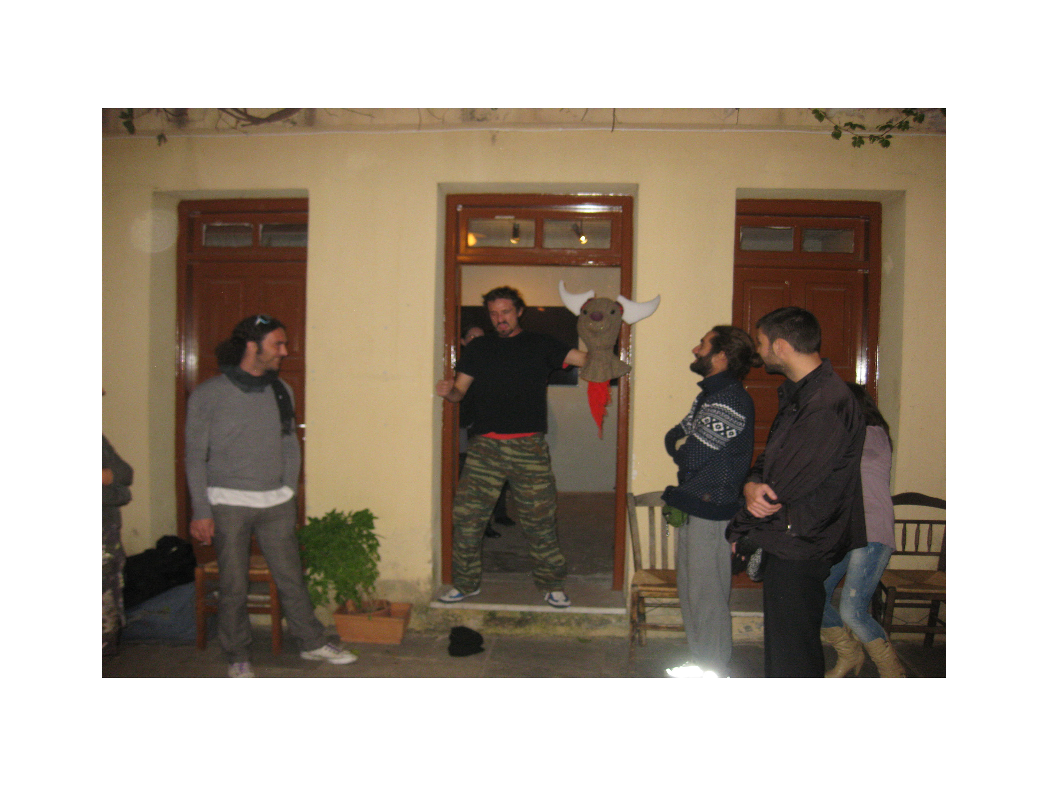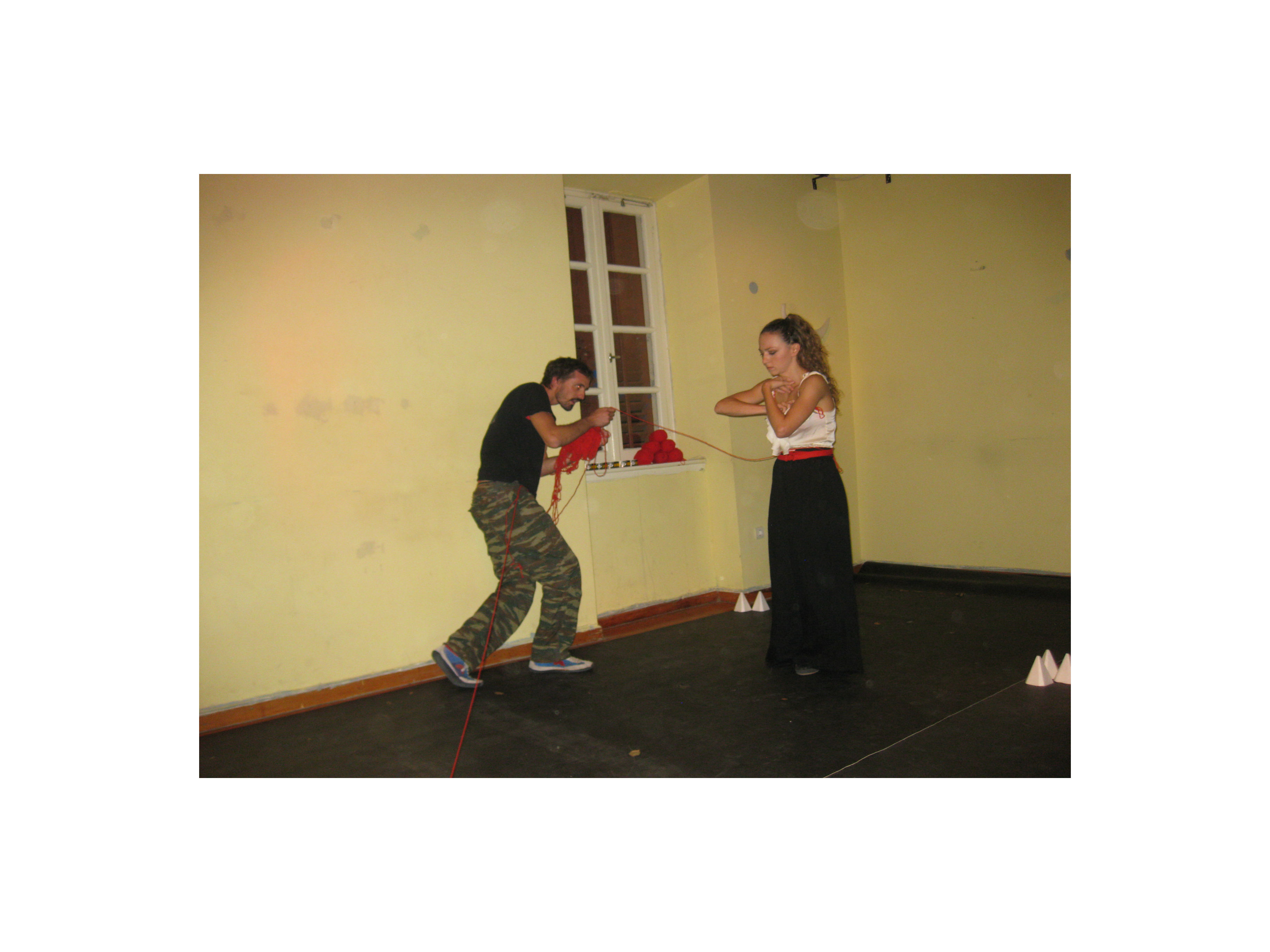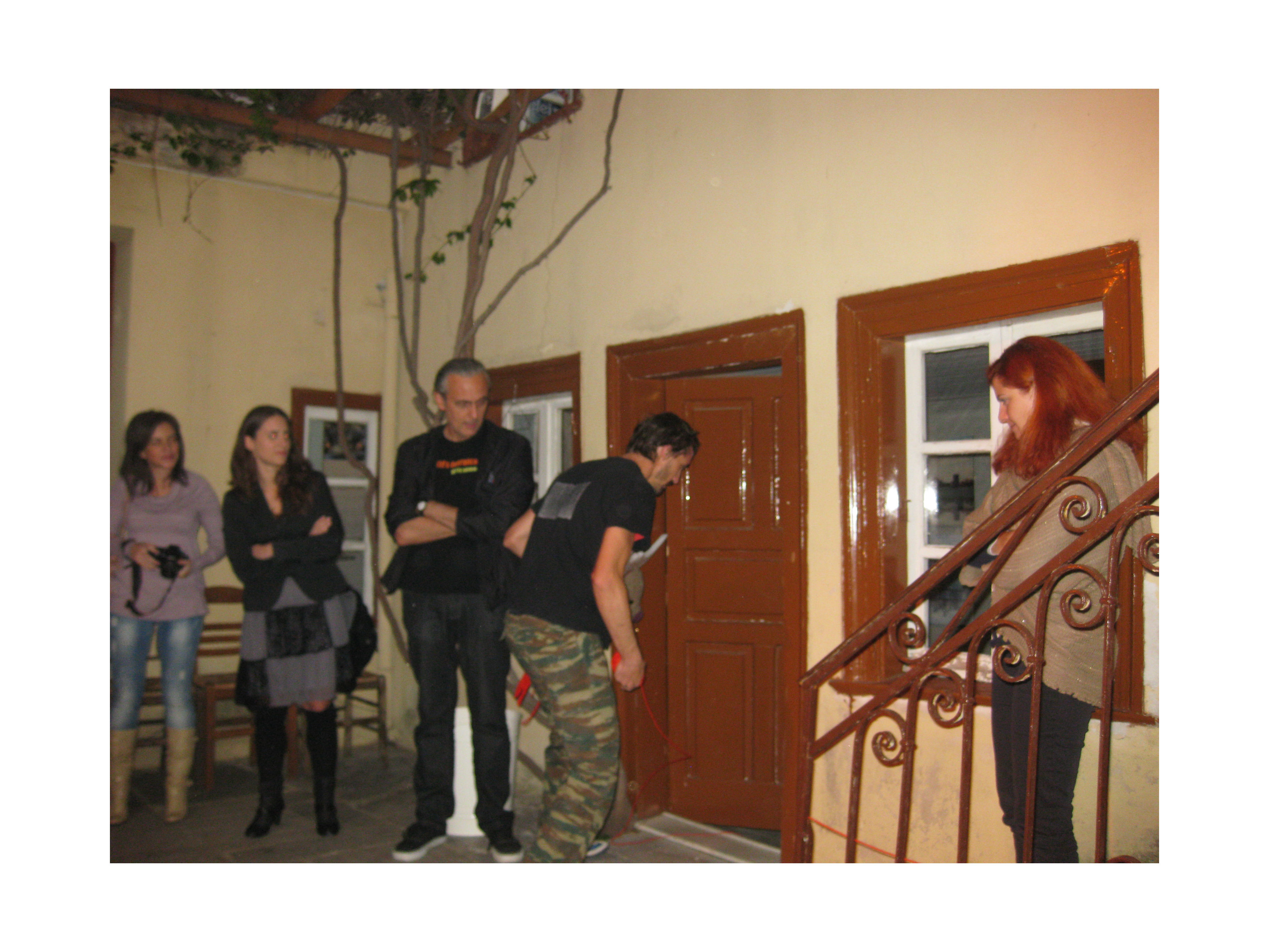 Paul started by standing with the audience outside the house and like Theseus he used a strong body language to get the door to be opened. Once inside he intertwined his performance with seeking and finding the red thread which took him through the various rooms downstairs of that beautiful building in the Plaka. He used a broom stick and the cover of a rubbish can to imitate the Greek warrior. He was fierce. Ready to attack.