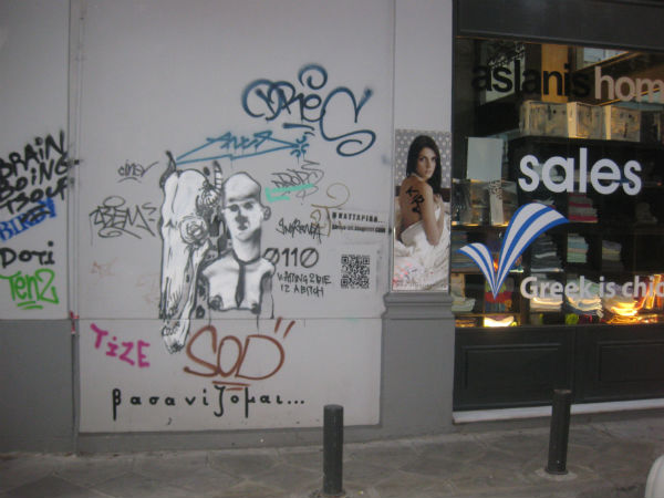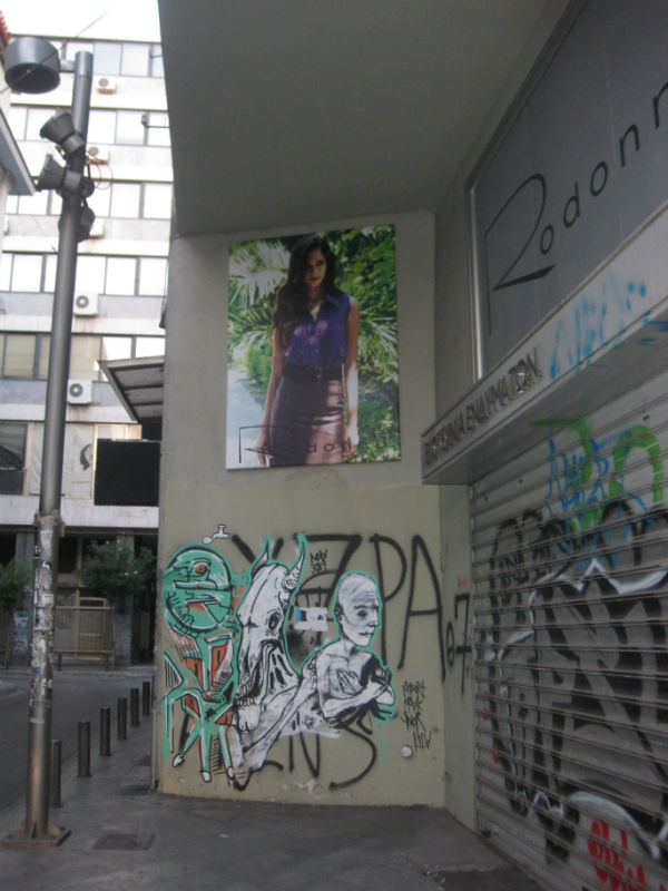 It might not do justice to the graffiti to subsume it in this case to a certain sales pitch. Yet the contrast to what is being offered in a sales under the brand name "Greek is chic" could not be greater. The man has a tie around his neck as if the only clothing while the strange animal head beside him reminds of skeletons of animals found in the countryside with bones long bleached by the sun.
