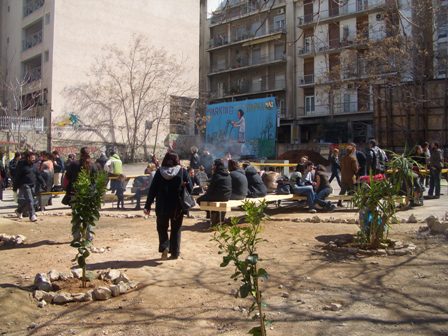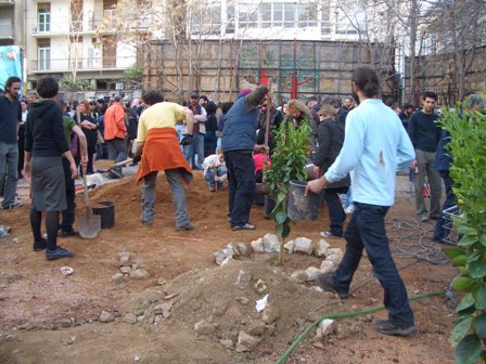 In Athens something happened after the events which followed the killing of Alexandros on Dec. 6th 2008. People in the district of Exarchia took over a parking lot and revamped it completely by tearing up the pavement to plant instead trees. There was created a non commercial park like setting to be used for not merely meetings or relaxations, but one corner was reserved specifically for the children. Many donated all kinds of trees, while others planted them and still others created footpaths and even stone benches with colourful mosaics. Lucky was that the owner of the plot of land did not call for the police to have the newcomers be evicted. It belonged to the Technical Chamber with many engineers and architects in favor of giving Athens some breathing space. There is generally a lack of green spaces in the city having been built up rapidly and virtually without any consistent planning.