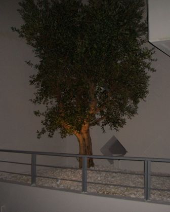 Breathing space has a lot to do with not covering the earth. This is not possible when 100% of the plot of land is being built upon. One compensation can be to pretend to have such a space required by law. This is done to plant an olive tree on top of the built area and besides the entrance of the parking garage underneath the house.