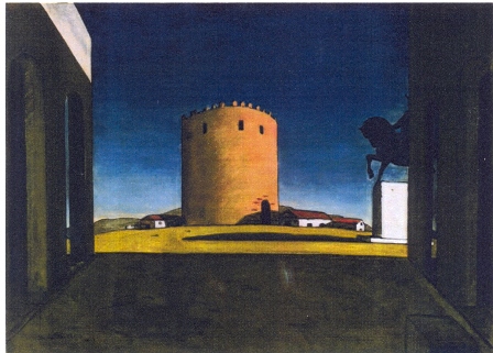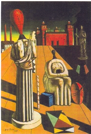 In his disquieting muse juxtaposition expresses the contrast between movement and no movement, between figures playing on the chessboard of the city their games while their faces are hardly distinguishable from the monument in the background but which has oddly a more humane face. In Greece poets would sing about that statue which could step down after midnight to cross the platia and join those who stay up late.