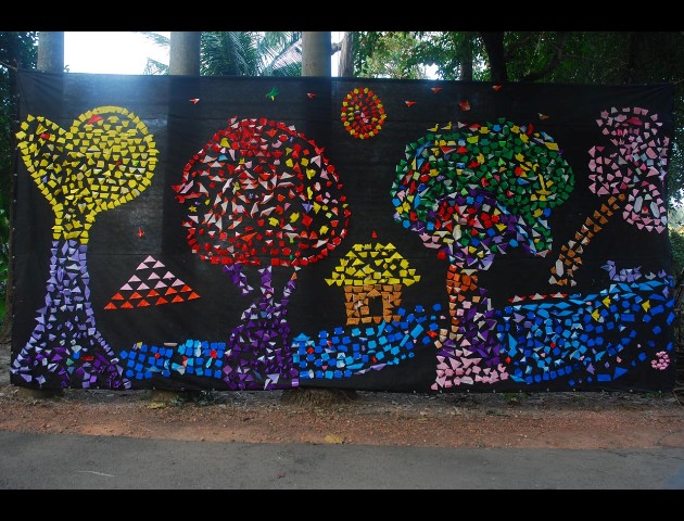 This year they used colour origami of more than 6000. They pasted them on a black canvas. The theme is climate change.