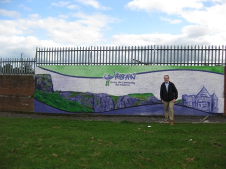 Bernard Conlon and the wall mural he commissioned to commemorate the EU-supported North Belfast Urban II programme, Lower Oldpark, Belfast – a unionist area separated from nationalist areas by a peaceline. Bernard Conlon provided communications advice to the agency delivering Urban II.