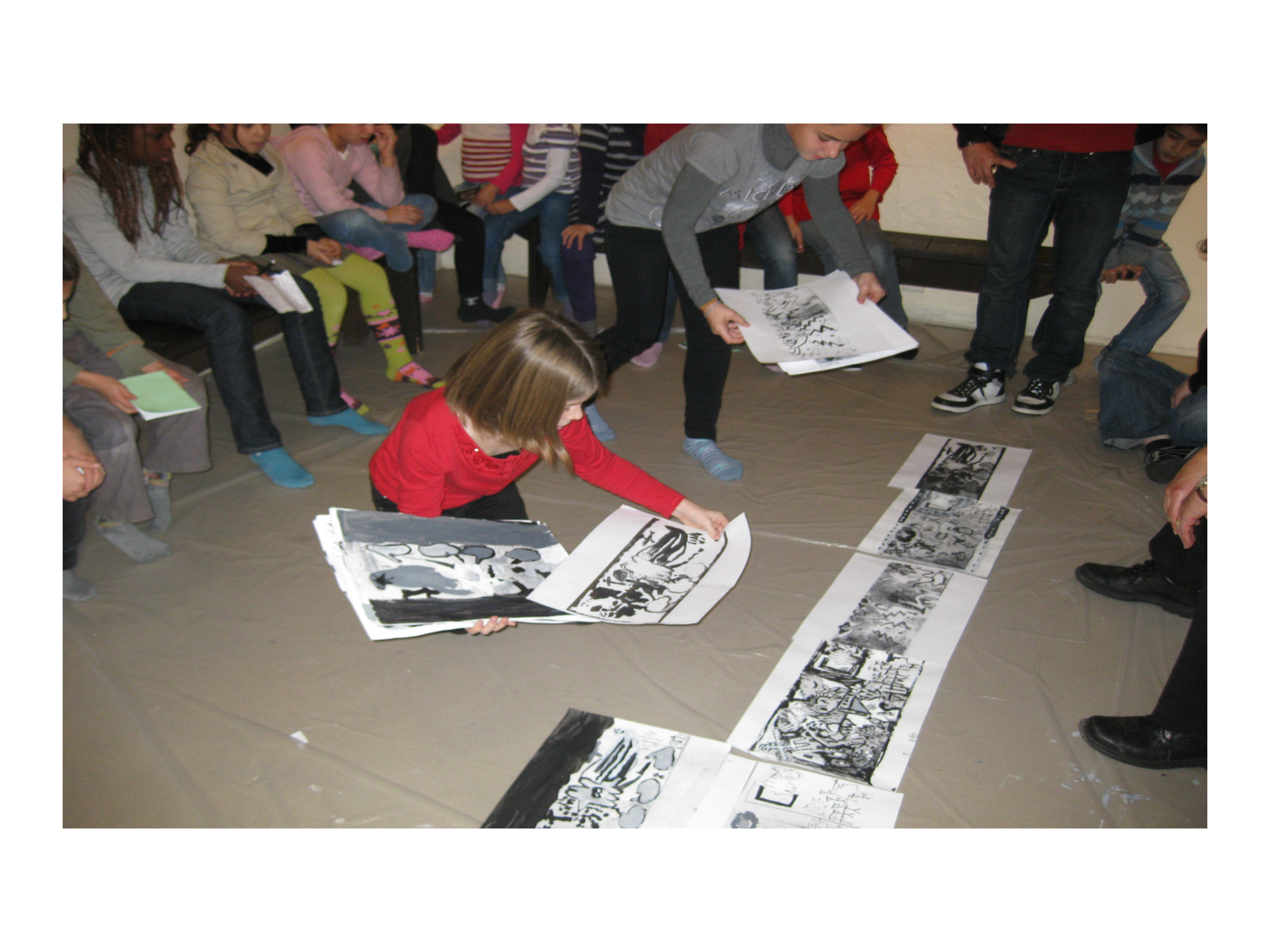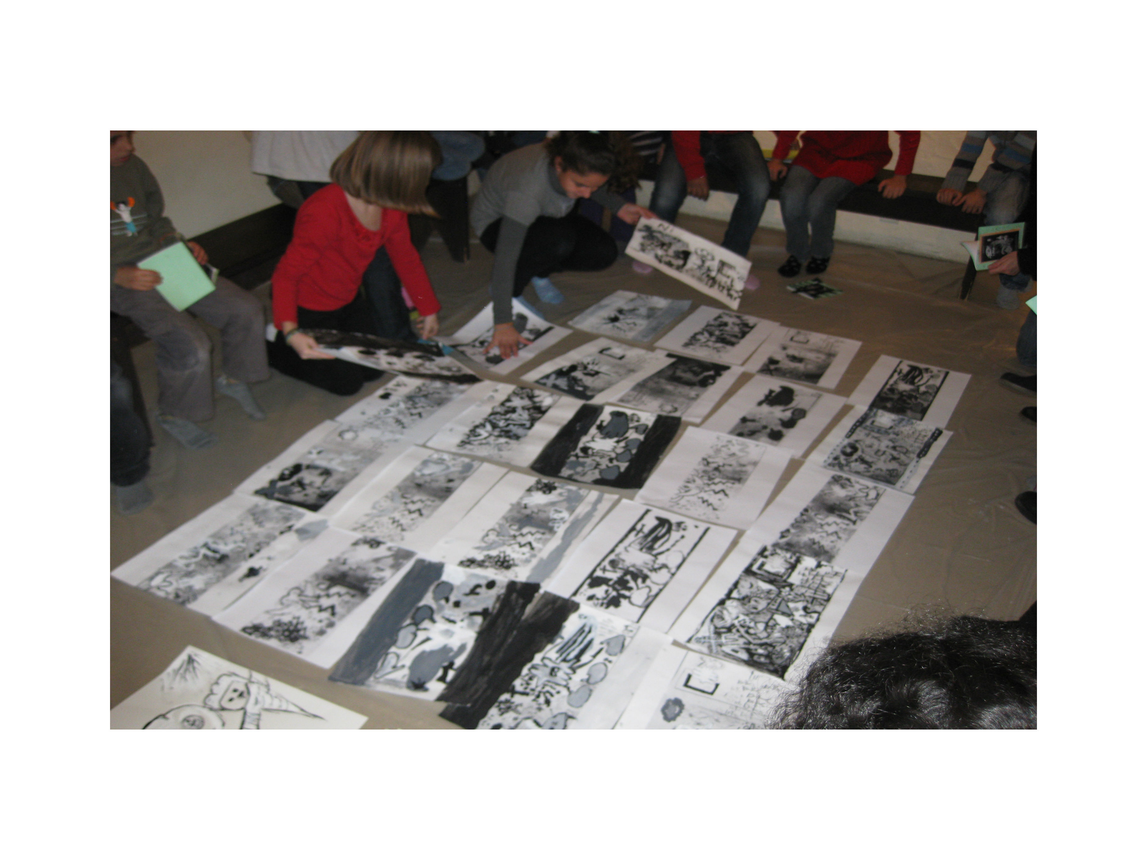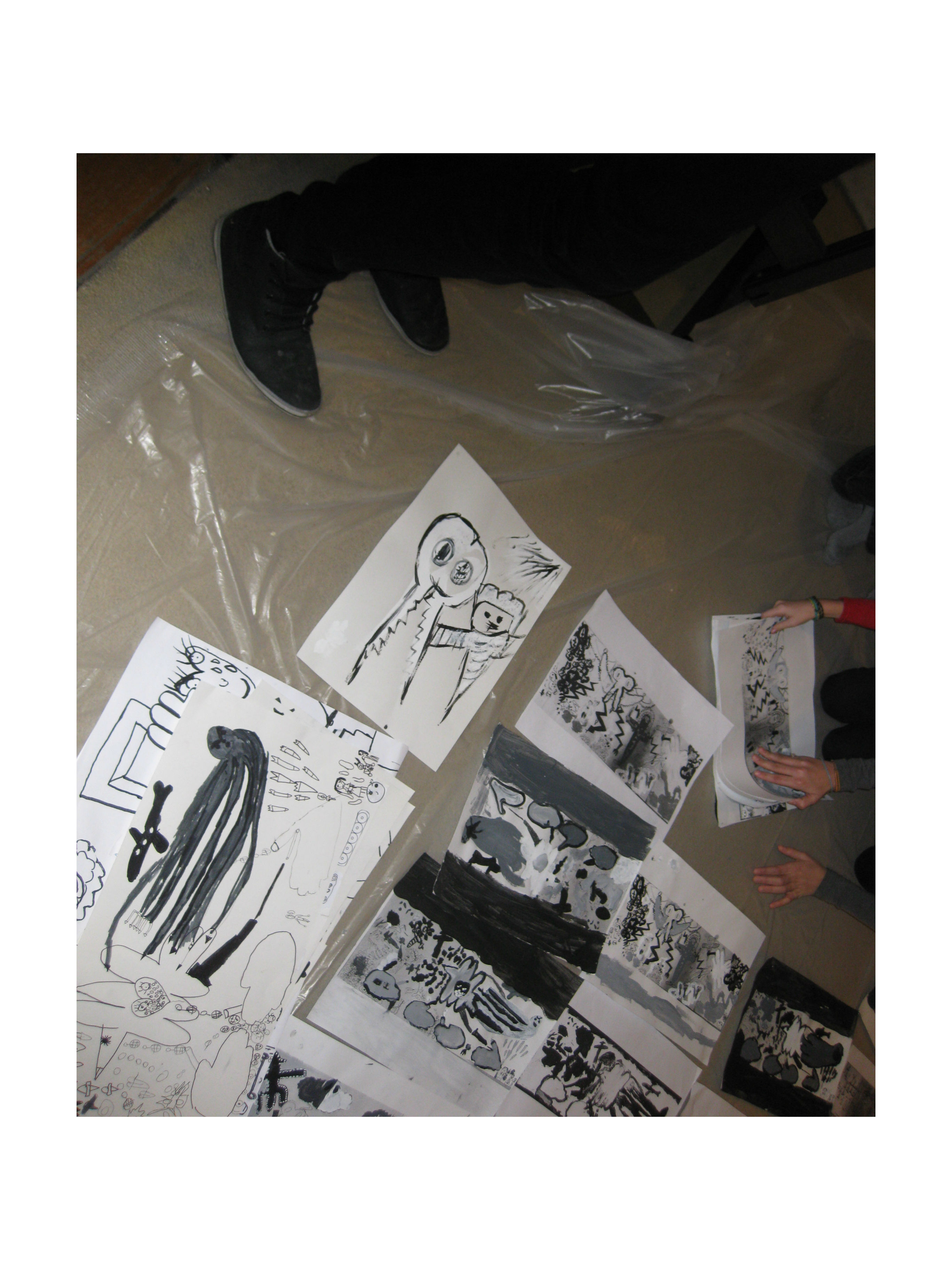 After this discussion between Manuel and the children, they wanted in turn to show him what they were doing. Hence they went to fetch their own sketches and laid them out on the floor in front of Manuel.