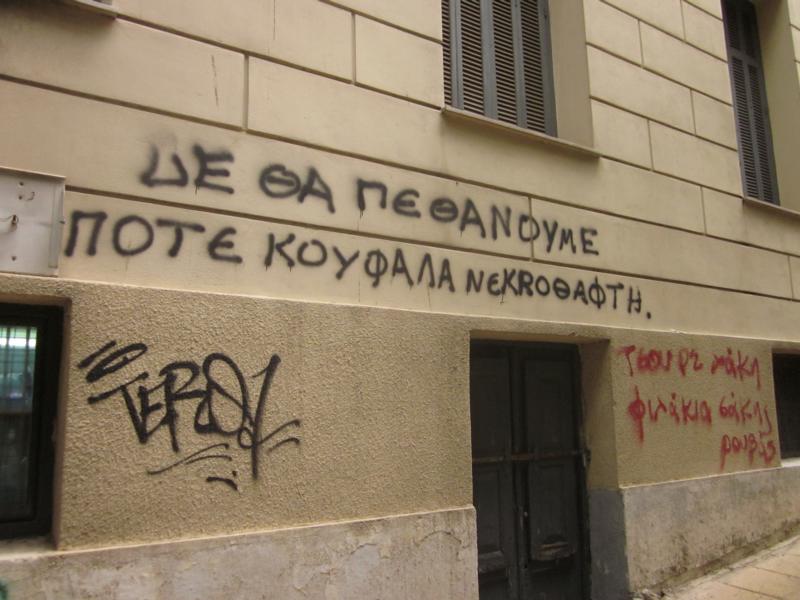 This slogan is vis a vis a funeral parlour on Hippocratous Street