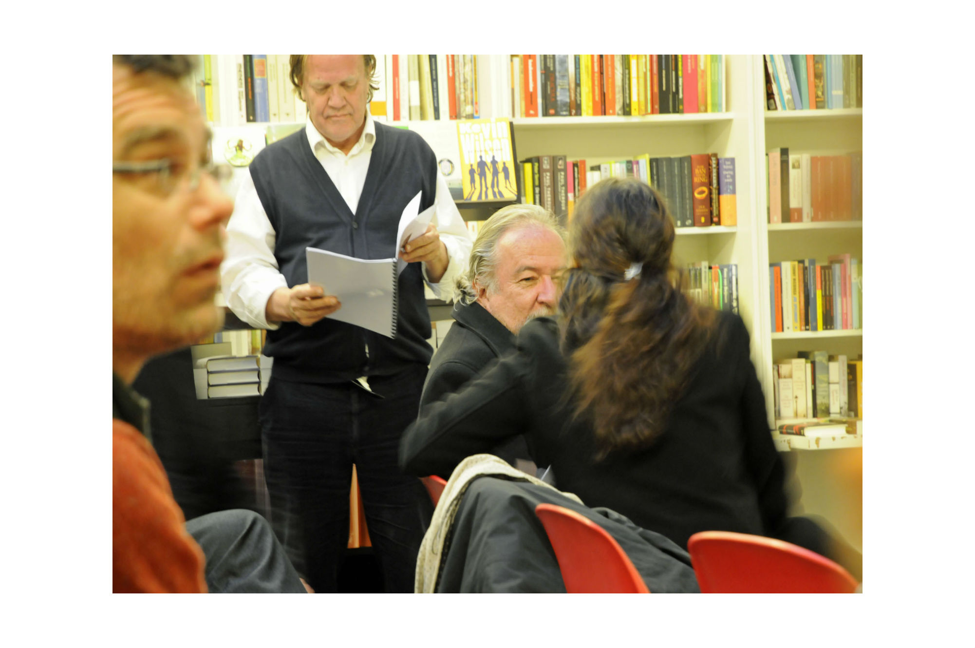 Hatto Fischer had to select like all the others two poems. At first he wanted to read the poem 'Unremittant soul', but when he heard during the discussion Fernando Rendon refer again to 'stones', as he had done at the European Commission, he decided to read a poem from the Collection 'Dialogue with Silence - the Paros poems'. It deals with stones or more precisely with stone walls. Interestingly enough a woman came up to him after the reading to say the stone walls in a landscape remind her more of a seam after having sown something even if like a chicken or a Turkey's belly after having put filling inside. More needs to be said about that poem about the stones since they have many metaphorical meanings, including bread for the poor. Why Jean Paul Sartre linked stones to a sign of Racism, that is also a hypothesis in need to be examined. The other poem he selected for reading stems from the Collection 'City Poems' just recently re-written after having transferred them from a small note book in anticipation of all the readings they would be doing in Paris, Antwerpen and now here at Passa Porta in the midst of Brussels, indeed very close to the Bourse and the Flemish Cultural Centre.