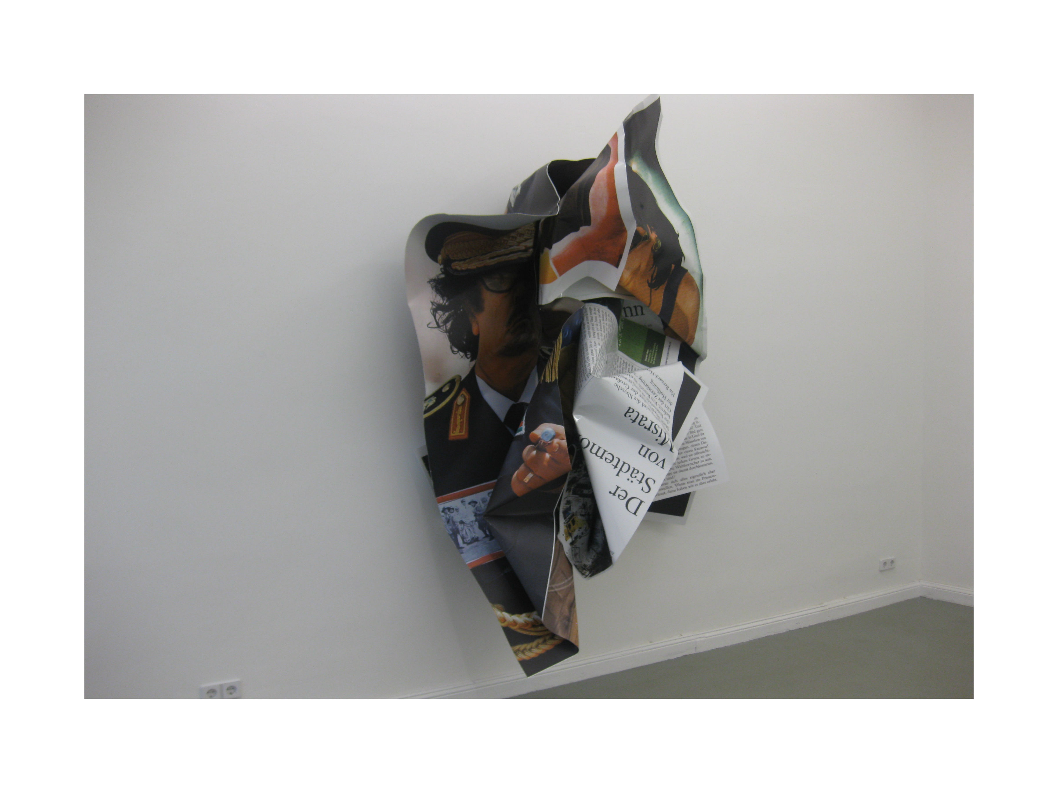 There is unease, pain in the air, when seeing Gaddafi crumbled up like one does after having read a newspaper and ready to use it to clean windows or just to throw it away. The unease is about the Western world being unable to halt the escalation of violence until Nato had to enforce a no fly zone over Libya, but that was not all. The ground work to prepare the overthrow Gaddafi by force followed the peaceful transitions in first Tunesia, then in Egypt. Images of peaceful demonstrators questioning those who had been in power over thirty years is a powerful message in the West yet equally feared. Translated into such an art form, one can ask of course if this is a polit message of a new kind, especially when one knows how Gaddafi ended. It reminded very much of Saddam Hussein but the latter was not killed on the spot but was first tried and then executed as the death penalty would be enforced whenever someone does not show full compliance and readiness to cooperate with the West. That standpoint needs to be tested by means of the arts. The question is, therefore, what message such an art work gives, if not a pieceful way of merely crumbling up the newspaper once no longer actual. Real time moves on faster than often the blink of the eye can tell as to what else lies ahead in such a fast moving, equally practical resolute world once determined to no longer accept such a kind of benevolent dictatorship as was the one exercised by Gaddafi.