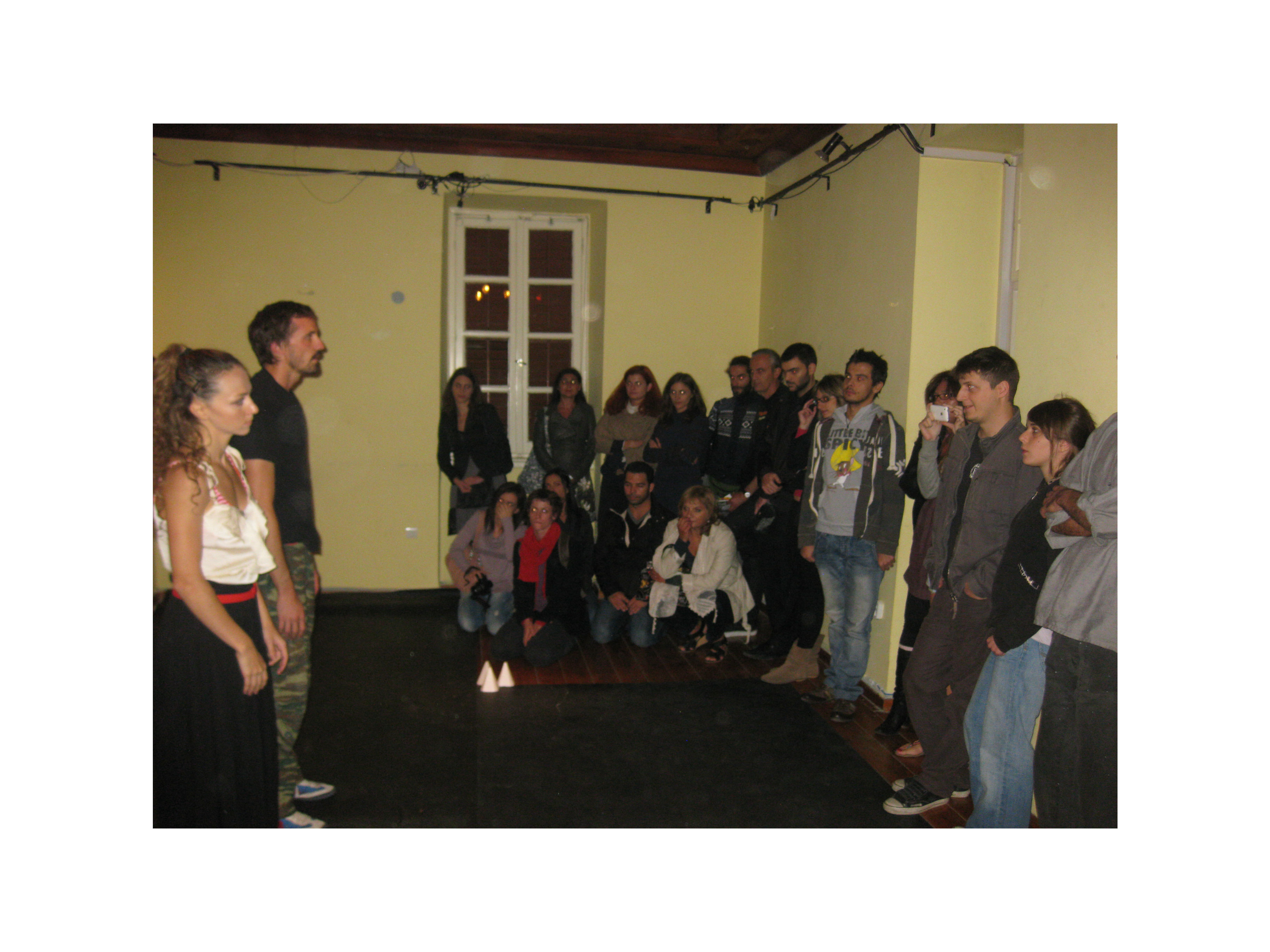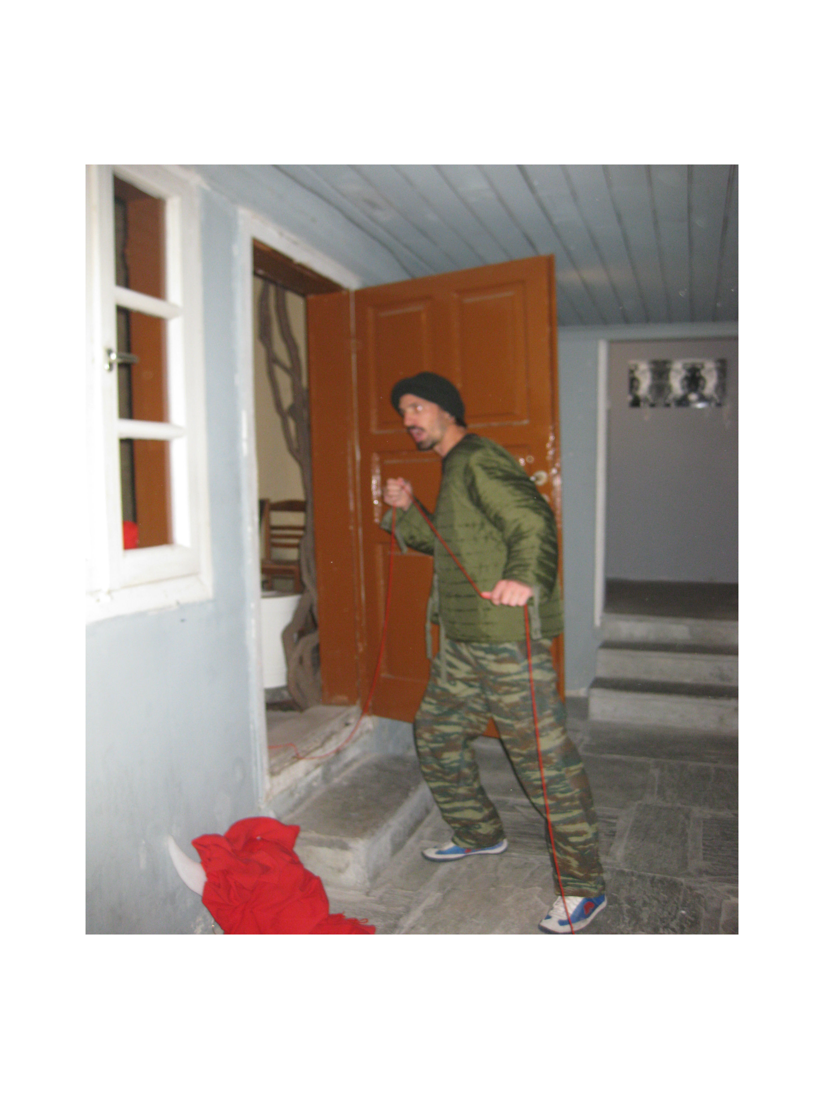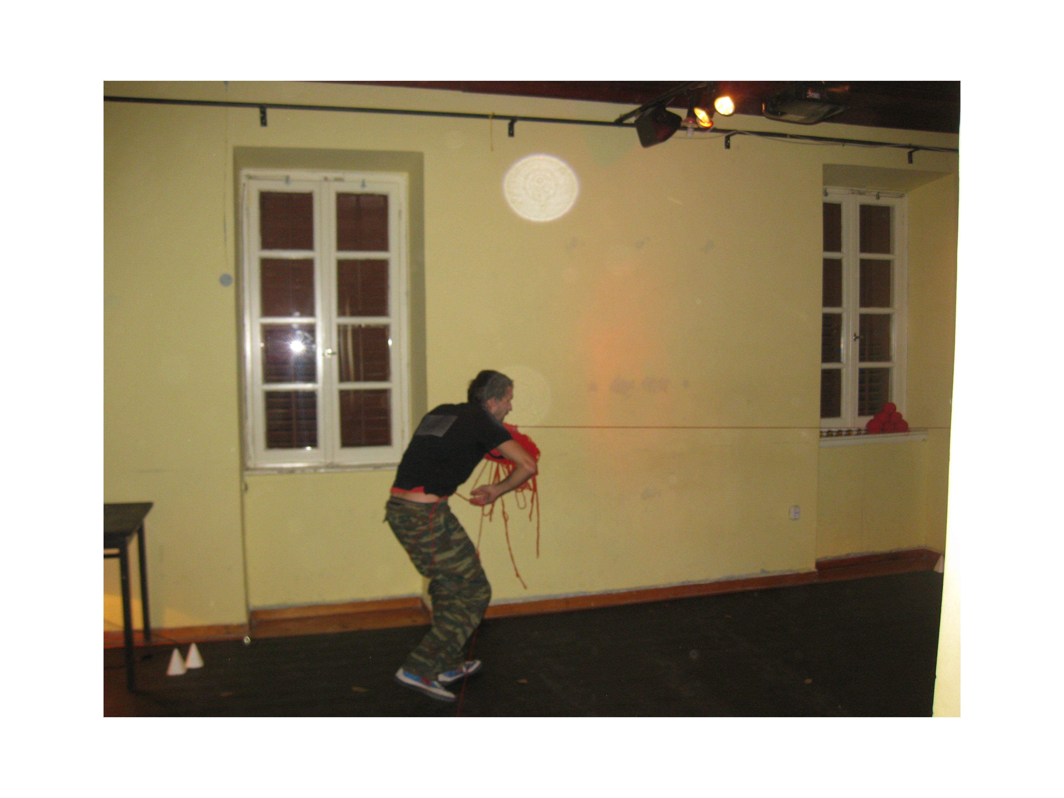 Paul started by standing with the audience outside the house and like Theseus he used a strong body language to get the door to be opened. Once inside he intertwined his performance with seeking and finding the red thread which took him through the various rooms downstairs of that beautiful building in the Plaka. He used a broom stick and the cover of a rubbish can to imitate the Greek warrior. He was fierce. Ready to attack.