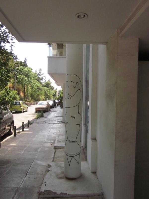 For instance, there can be found an example thereof at the entrance to a house on Dafnomili and where a tourist guide lives. Whenever she returns from work, and that means having visited with tourist groups places like Delphi or Olympia, she would be glad to return to her own dream world. The black marcation at the entrance is for her both a reference and greeting to have arrived back home. The figure is veiled slightly to indicate the element of mystification. The figure is seated while contemplating her hair - a simple gesture of frank beauty.