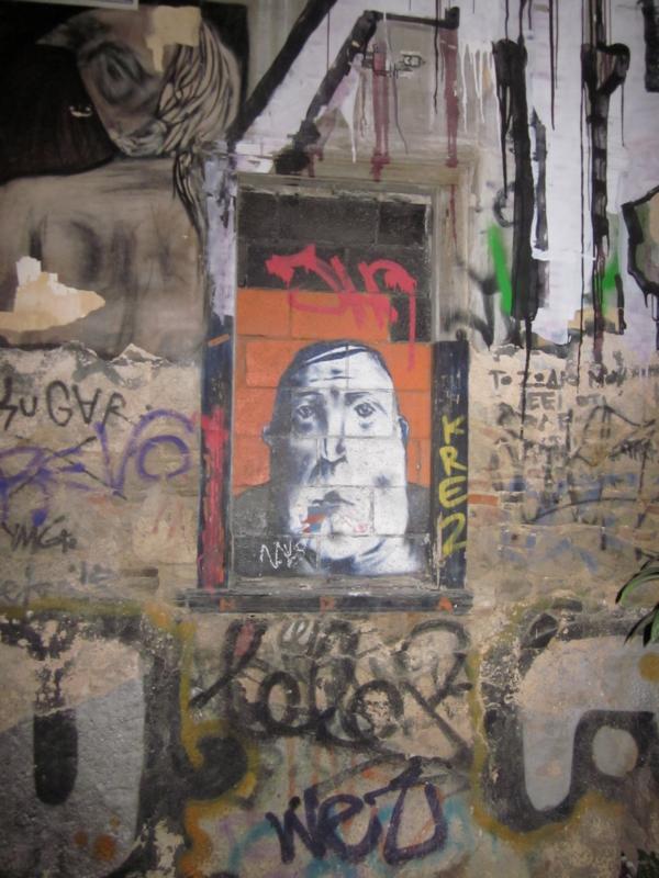Naturally associations eject a certain meaning to let us make sense of what we perceive. For instance, the image of the man with a brick wall as background reminds of Humpty Dumpy who 'sat on the wall, had one day a great fall, broke into thousand pieces, so that even the king's men could not pick up all the pieces and put him together, in order to let him sit once again atop of the wall!' What is wonderful about this graffiti is that the well known image becomes a signature within a former window frame. The materials of the abandoned house create a natural aesthetic, and thereby accentuates this imaginary story about the risk to fall or to be completely walled in.