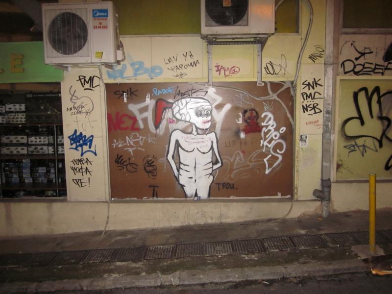 This loss of theory was all the more at risk once the youth felt surrounded by only a crisis and a society with no exit strategy readily at hand. Following such shouts like 'don't shit on me' or 'don't make shit', there was still the other advise given by the older generation which had gone through Second World War and came out alive but determined to put their minds to an organizational logic based all the more on technology and technical know-how: "learn how to make out of shit gold!" Yet in no uncertain terms, there is this one graffiti depicting a graffiti artist with a most telling self comment becoming a huge question for the 'self', but not only!