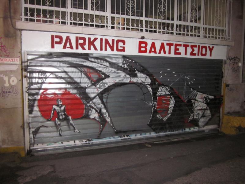 Incredible is a figure depicted as just sitting there as if in wonder about such a weird world. It can reflect shattered dreams, lost relationships, but the posture of the figure is also one of wonder as to what misconstruction has been achieved. At times the structures have the resemblance of a large spider with a red eye, at other times it reminds of Picasso's famous way of showing the eye or simply air in a three dimensional manner. But this is not the twentieth century. Man has flown already to the moon and the millinium turn in 2000 came and went without any of the catastrophes many had predicted. Literally speaking, it left the world in a mumble and jumble at times most difficult to make sense of. If the graffiti artist or artists wishes to depict the absurdity of it all, no better place could be picked than this entrance to a parking lot. The poetess Katerina Anghelaki Rooke would describe this sanity / insanity of daily life as cars leaving in the morning and returning in the evening in the hope to find the same parking spot they had left in the morning. During the day they would enter such a parking lot and come out when it was time to return home. The latter would be located way outside the centre of the city.