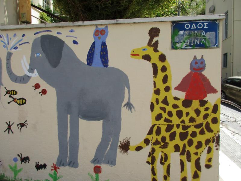 At the German church located on Sina Street, a transition from tagging to playful to purposeful graffiti to something much more intended can be observed. The wall of the church faces Dafnomili street where one enters Sina at the French Institute.