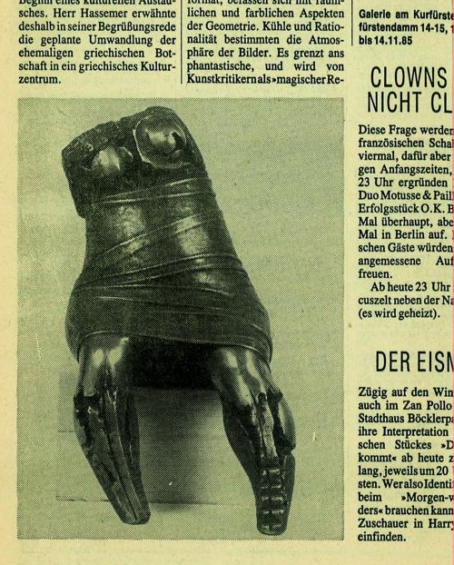 In Anwesenheit des griechischen Botschafters in Bonn, Herr Katapodis, und des Senators für kulturelle Angelegenheiten, Herr Hassemer, wurde die Ausstellung des Malers Christos Caras, und des Bildhauers Giorgos Georgiadis, am Montag in der Galerie am Kurfürstendamm eröffnet. Die zwei Künstler vertreten Griechenland auf der Biennale in Venedig 1984. Ihre ungewöhnlichen Arbeiten, die sich deutlich von modernen Tendenzen unterscheiden, wurden dort bereits international anerkannt. In Berlin wären sie allerdings auf Schwierigkeiten gestossen, hätte es nicht die Unterstützung von Frau Melina Mercouri gegeben. In der bevorstehenden Kulturmetropolen-Politik der EG-Länder bedeutet dies den Beginn eines kulturellen Austausches. Herr Hassemer erwähnte deshalb in seiner Begrüßungsrede die geplante Umwandlung der ehemaligen griechischen Botschaft in ein griechisches Kulturzentrum.