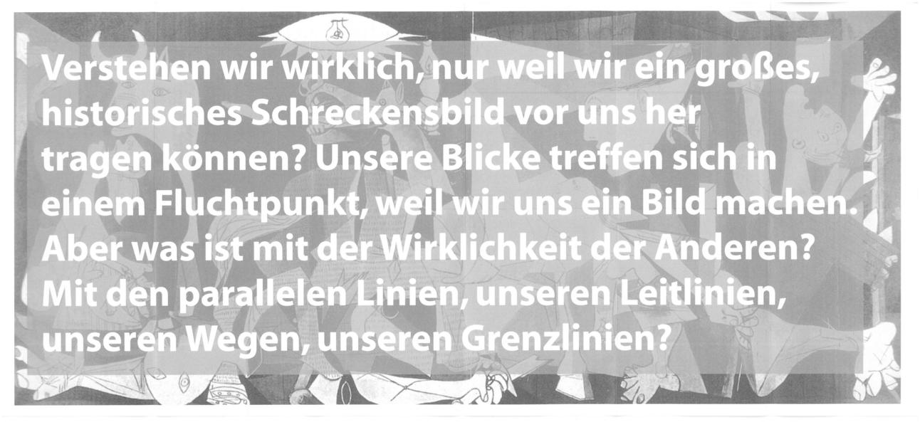 The artist Anka Landau has imposed a text upon Picasso's Guernica, see Work process with refugees - Anka Landtau She seems to suggest that this famous mural as response to the violence enacted upon innocent citizens of Guernica back in 1937 has become by now such a world wide imagine into which many flee once they cannot stand any longer reality. However, she goes on to say that perhaps not from this particular picture, but from others into which many flee new lines are drawn to link up with reality. This allows people to reconnect with themselves while searching for a possible way out.