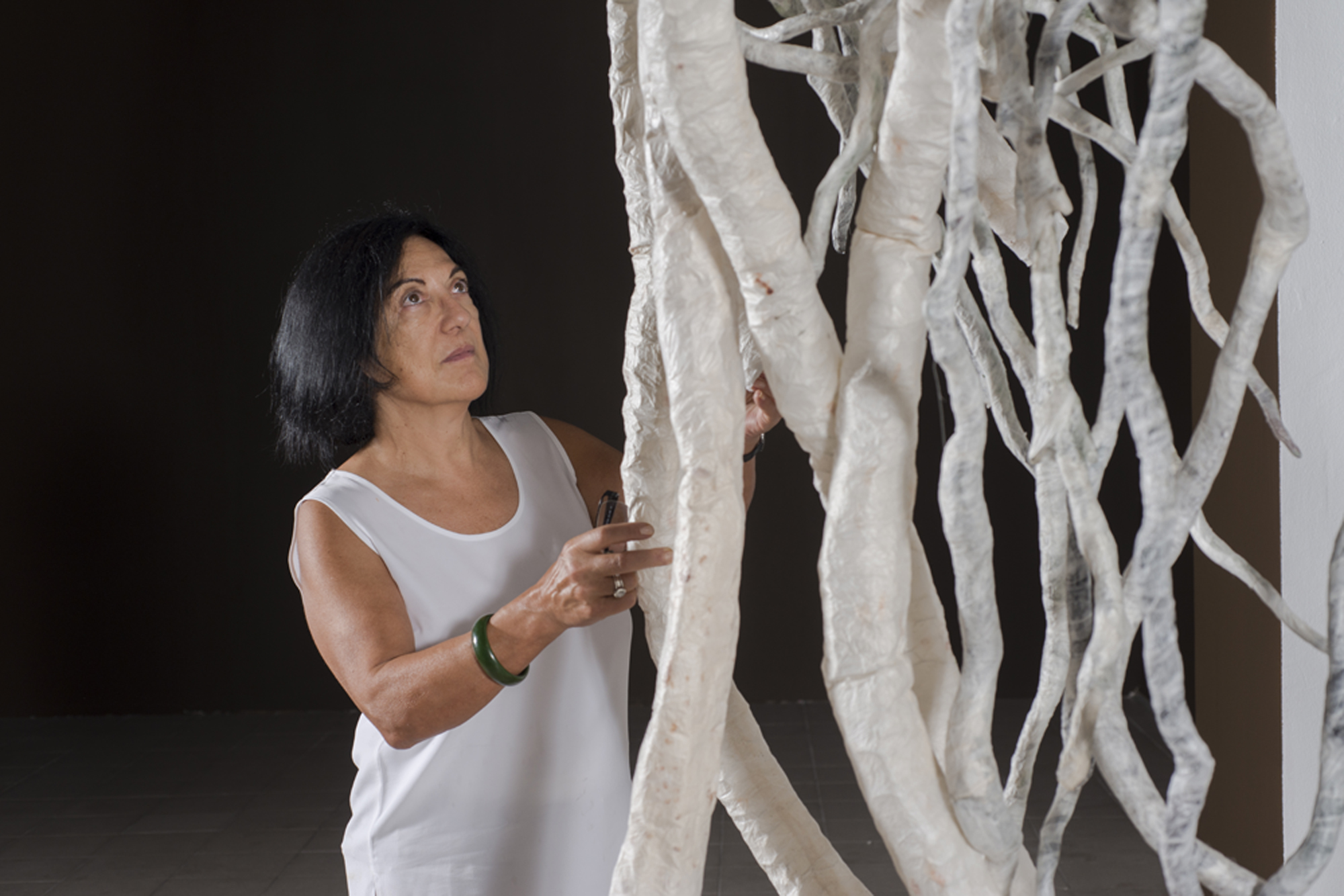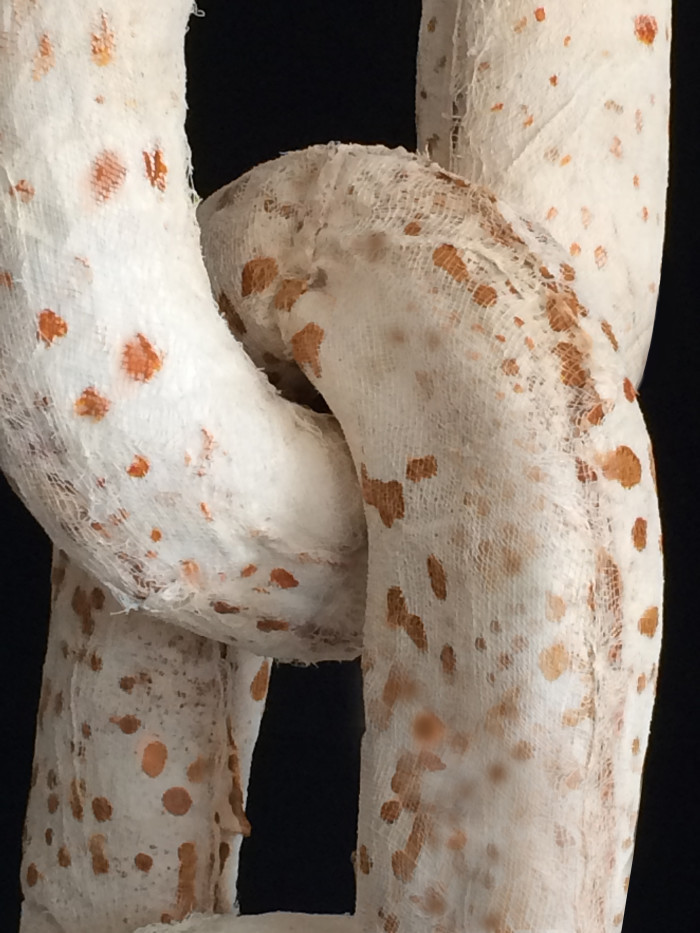 Wenn eine Künstlerin sich der Kette als Symbol bedient, dann schwingen mit mythologische Assoziationen. Zu denken sei an Atlas doch Ketten kannten auch die Sklaven die per Schiff von Afrika nach Amerika verfrachtet wurden, und dort weiter in Ketten leben und arbeiten mussten. Es ist also ein universeller Symbolbegriff. Entkettung entspricht darum Befreiung. Vor allem diejenigen die im Kerker dahin schmachen mussten, sie litten unter Ketten die an ihren Hand- und Fußgelenken angefestigt waren. Wunderbar sind die von Azade Köker dargestellten Ketten im Prozess einer Ent-kettung weil nahe kommend einer Schlange die sich zu enthäuten beginnt.