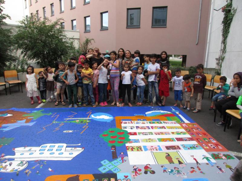 They used for painting the mural the upper deck of the former parking garage. There the mural was laid out for eight months, from January to August 2016. In the end, the mural told the story on how they got from Syria, Afghanistan and elsewhere to Berlin. The mural documents the dangerous voyage across the Mediterranean Sea but ends on a happy note with all looking out of the window of the school they attend.