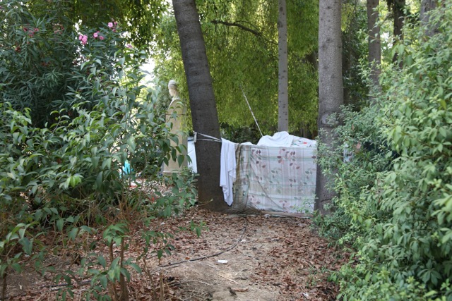 In turn, the migrants experience all kinds of confined spaces. It starts with make shift camps on Lesbos, but also in down town areas of Athens. They use often blankets to delineate some private space.