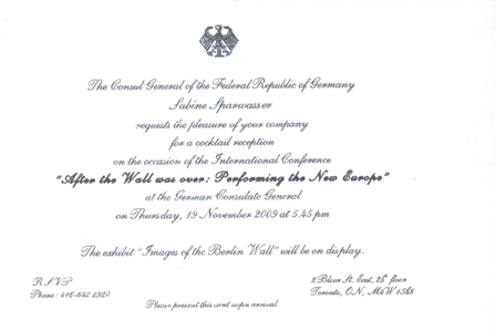 "The small exhibition of images of Berlin Wall fragments that you'll see at the German consulate was created by Blake Fitzpatrick and Vid Ingelvics. Blake is one of the co-curator's of War at a Distance (see http://poieinkaiprattein.org/conferences-symposiums-workshops/europe-performing---toronto-nov-2009/gallery-discussion-about-soldiers-in-afghanistan/)