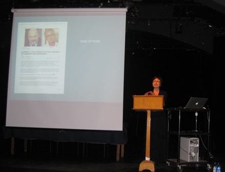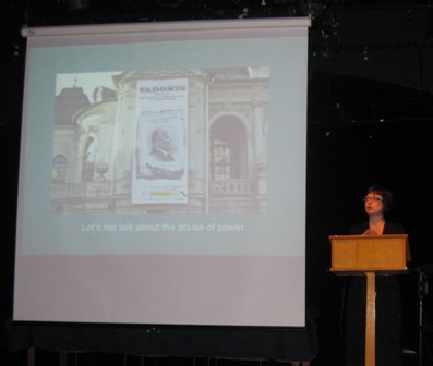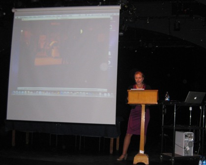 "Lets not talk about abuse of power - a theme of discussion in Latvia" was displayed on this slide of her power point presentation. She reflected the power or lack of theatre when a society becomes apolitical. Then forms have to be developed like street theatre so as to follow up one major idea, namely how actors interact on stage, so do people in their common and everyday lives. In Latvia this has worked in particular well when there is widespread fear to speak up or else a huge suppression of issues linked to the Russian speaking population. After the fall of the 'iron curtain' Latvia has yet to find some cohesion and knowledge of governance free of corruption. All this reflected in her work taken up after she returned from Canada to settle down to Riga where her family had come from originally before they too immigrated to Canada where she was born. During her presentation she spoke about a site-specific theatre performance called "Escape From Troy". It explores the experience, both historical and modern, of those who have been forced to leave or flee their homeland.