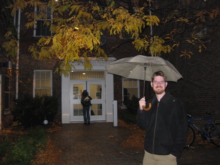 Mike Lawrence at entrance to University College for Drama