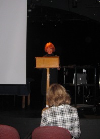 She begins her presentation bearing the title: "Hybrid of dance or something else entirely - Several witty observations a la Gombrowicz” performed by the theatre 'Dada von Bzdulow' with a quote from Vaclav Nizynski’s diary: “I will pretend to be a clown, because then I will be understood better. I want to say that a clown is acceptable, when he expresses love. A clown without love is not from God.” She then states her thesis that "in our 'world without God' the dancer in not considered a priest and the dance is not associated with liturgy. Now we dance for entertainment, for the cameras. If someone dances “seriously”, he is considered a ridiculous lunatic…"