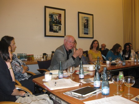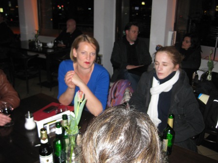 The students came together with Pia Kleber and Stephan Clarkson. There was as well Mike Lawrence who had already spend some time in Europe to pursue his studies. There was a day conference at Humboldt University, May 5th and a meeting at the Institute for Cultural Diplomacy the following day with lunch in the garden of the House of Literature on Fasanenstrasse. The evenings were filled with going twice to the Schaubuehne to end up then at Terzo Mondo.