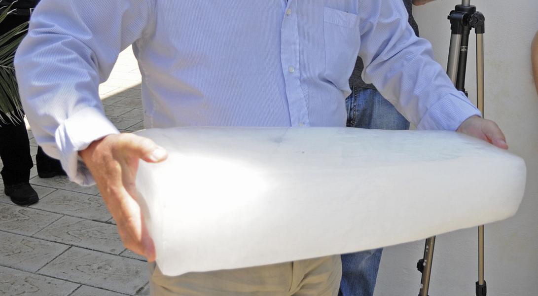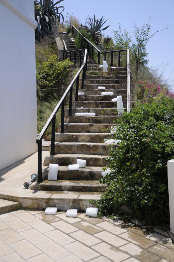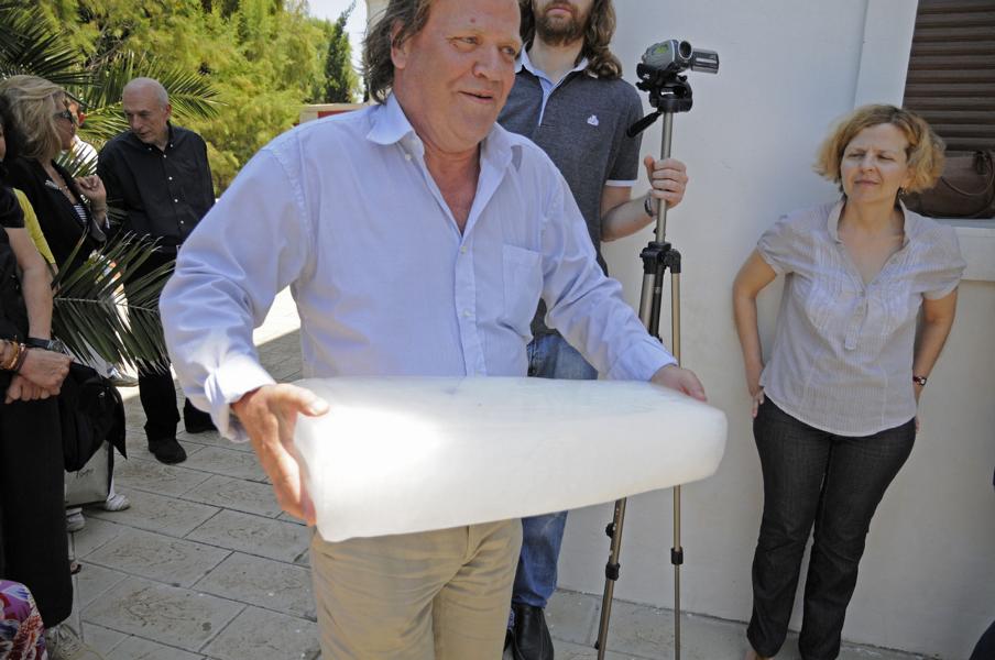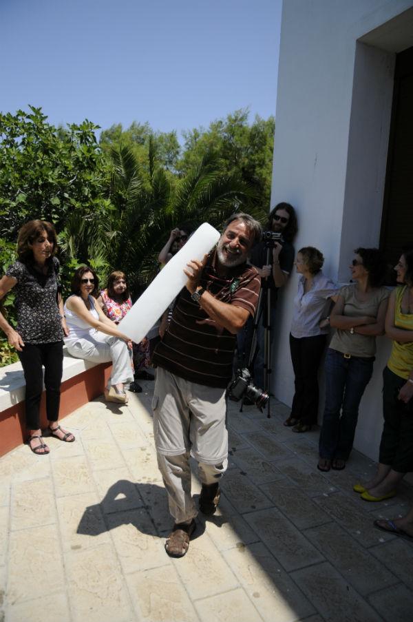 Jakovos Xenakis making a point about 'saving a drop of water' - Maria Bakari drinking