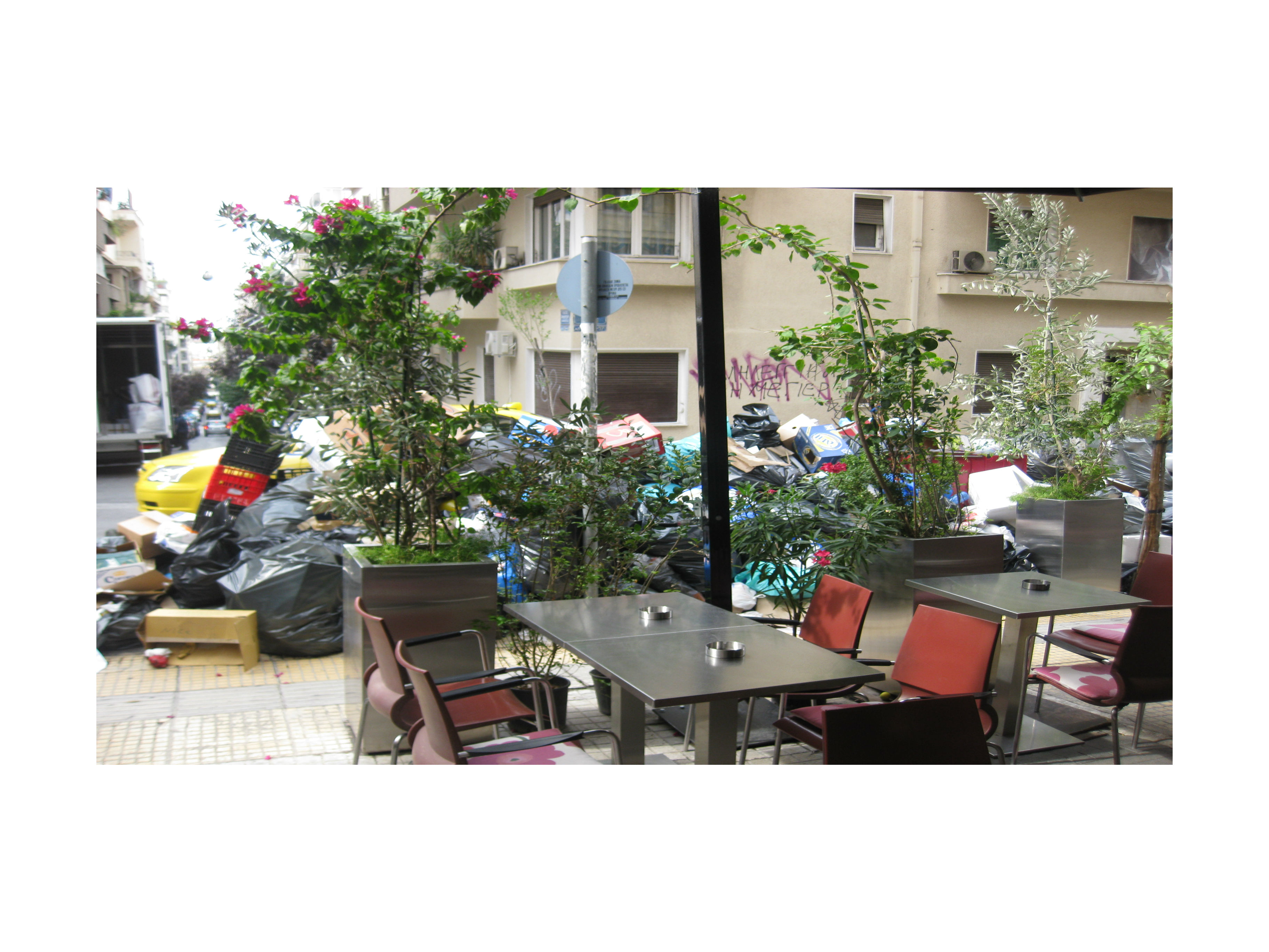A bad smell lingers in the air. The rubbish strike lasts by now for more than one week. Even though everyone tries to place their garbage into big blue or black plastic bags, still at some spots the smell is becoming unbearable: on Skoufa, corner Omirou and direkt in front of the Triblenca and Rosebud bars. It seems as if rests of food stuffs emit the penetrating stench.