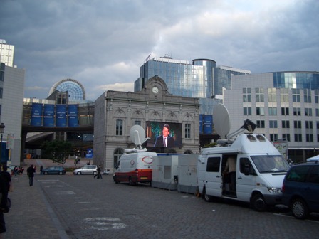 Awaiting European election results in front of EU Parliament Brussels