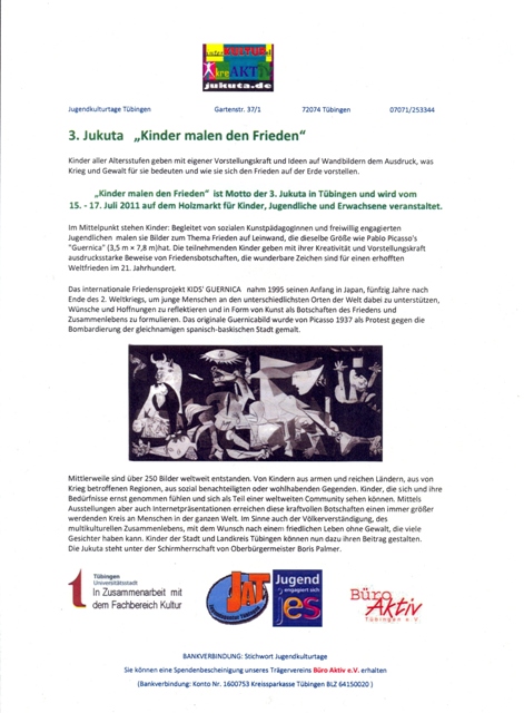 Workshop kids guernica Teil III am 17,7, 11h Epplehaus:Memorandum des Verstehens. Resolution beschliessen. Geplant ist eine Übergabe des Memorandum an eine überregionale Institution zusammen mit dem Tübinger Kids' Guernica Bild! Das Malprojekt Kunst für den Frieden startete im Juni an drei Kooperationsschulen. Die Friedensbotschaften werden auf einer Leinwand gemalt, die dieselbe Größe wie Pablo Picasso's "Guernica" hat, also 7,8 x 3,5m. Kinder und Jugendliche von Stadt und Landkreis Tübingen sind durch dieses Projekt Teil einer weltweiten Community.