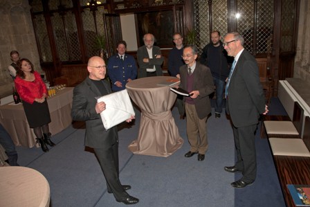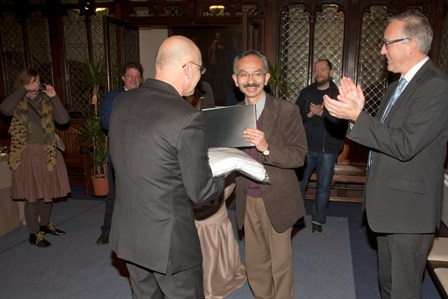 Takuya Kaneda donating a new canvas for a Kids' Guernica action in Wroclaw to Adam Chmielewski, director of Wroclaw 2016. This was done in the presence of the Alderman of the City of Gent, Rudy Coddens and participants of the Kids' Guernica conference which took place in Gent, February 18, 2011.