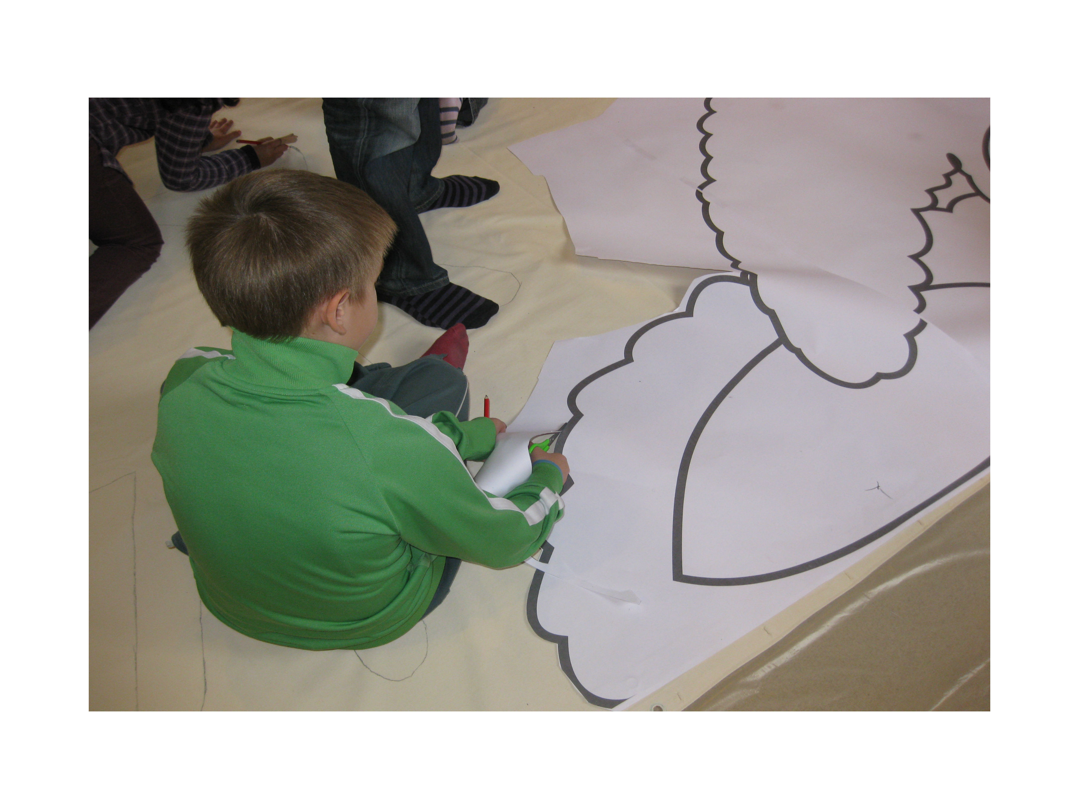 The image below shows how Boris Tissot and his collaborator super-imposed one image onto the canvas. After scanning the sketches of the children and then abstracting them to single design items, a lay-out thereof was printed onto sheets of paper. They were then used to cover the whole canvas. While this action was done by the adults, the children were just passive onlookers. And this happened not only during this precise moment when the canvas was opened for the first time, but throughout the subsequent actions amounting to only three days when work on the canvas was done. The rest of the many other days were spend on doing endlessly sketches.