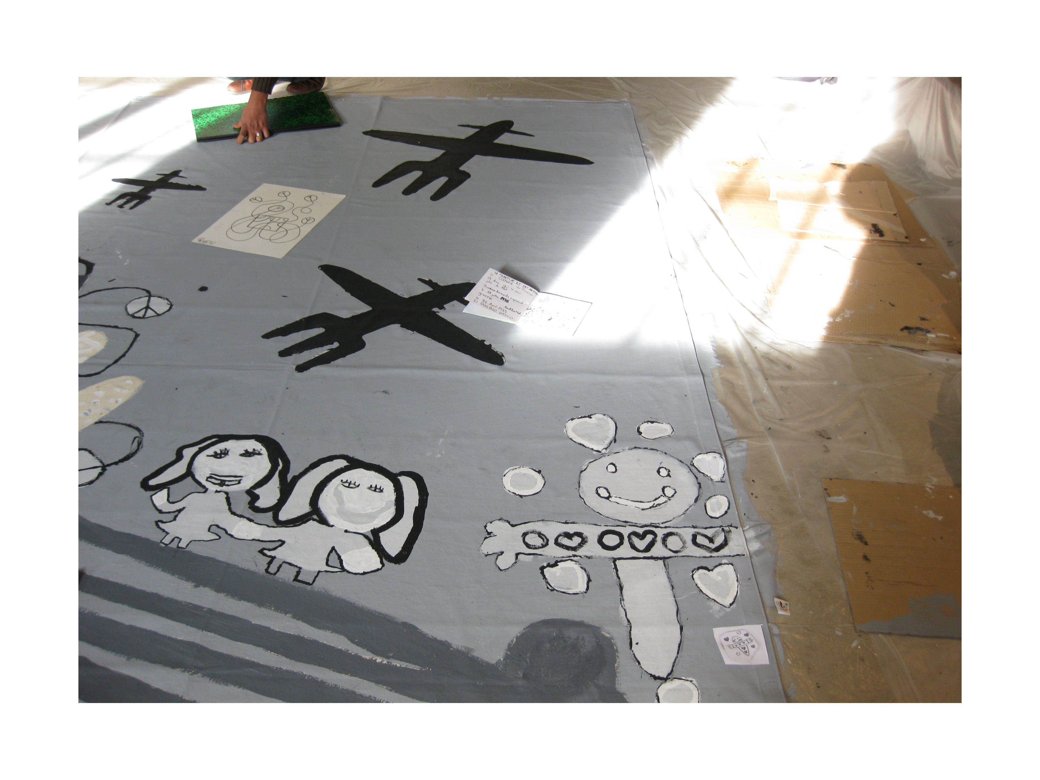 Since the action took place in full knowledge that this mural was going to be exhibited at the International Kids' Guernica exhibition in 2010, something more has to be said here. The exhibition was prepared by Tom Anderson with museum director Allys Palladino-Craig at the Florida State University in Tallahassee, Florida USA ensuring everything had a base. Thanks to her members of Kids' Guernica received some travel grants and this was in turn handled by Poiein kai Prattein. Boris Tissot had no hesitation to ask for himself and his daughter a similar grant but once he received it there was no word of thanks as to how this was handled. It needs to be mentioned that resources made available through Kids' Guernica should altogether not be taken for granted. The policy is to make things possible, but it would add another quality if this would be appreciated and recognized as such by those who take advantage of the resources made available. This includes the many murals painted already by children and youth all over the world.