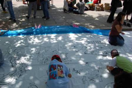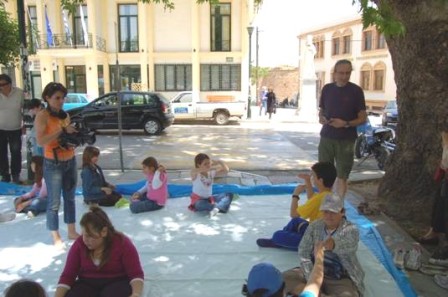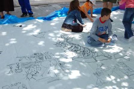 Initial drawings were made on the huge canvas which had been donated by Takuya Kaneda on behalf of the Kids' Guernica International Committee. The action took place during the Kids' Guernica exhibition in Chios, May 2007.