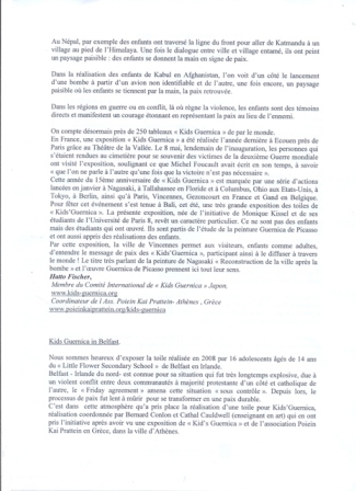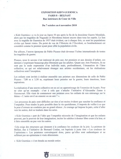 Kids Guernica fing an in Japan 50 Jahre nach Beendigung des Zweiten Weltkrieges. Damals hatten alle selbstverständlich Nagasaki und Hiroshima im Sinne. Das knüpft insofern an Guernica von 1937 an, da Kinder auf einer ähnlich großen Leinwand wie Picassos Guernica (7,8 x 3,5 m) ihre Wünsche nach Frieden ausmalen. Das beinhaltet zweierlei: Kinder können sich wie Picasso das bereits feststellte mittels ihrer Phantasie freier als Erwachsene äußern und gleichzeitig beinhaltet das gemeinsamen Malen einen Lernprozess der über den individuellen Schöpfungsvorgang hinausgeht. Letzteres erinnert an die Surrealistische Ausstellung die hier in Paris um 1927 abgehalten wurde. Picassos Bild der Frauen von Avignon wurde afrikanischen Masken gegenüber gestellt. Letztere wurden von unbekannten Künstlern geschnitzt und gaben einen kollektiven Schöpfungsvorgang zum Ausdruck, etwas für eine am einzelnen Genie orientierte westliche Kultur völlig fremdes. Auf dieses gemeinsame Lernen kommt es an. Das dabei entstehende Bild ist voller Überraschung und keiner weiß zuvor das Endergebnis. Kids Guernica Bilder entstehen in der ganzen Welt. In Nepal durchquerten Kinder Frontlinien um von Kathmandu zu einem Dorf am Fuße des Himalaja Gebirges zu gelangen. Nachdem dieser Dialog zwischen Dorf und Stadt aufgenommen wurde, entstand eine friedliche Landschaft in der Kinder sich die Hände geben als Zeichen des Friedens. Ähnlich ergeht es im Bild aus Kabul, Afghanistan doch da ist auf der einen Seite das Abwerfen von Bomben aus einem nicht näher markierten Flugzeug zu sehen während als Ausdruck einer Schizophrenie des Friedens die andere Hälfte wiederum eine friedliche Landschaft zeigt. Wo Krieg, Konflikte und Gewalt herrschen, sind Kinder an der vordersten Front und bekommen alles aus nächster Nähe mit. Erstaunlich ist darum um so mehr die Mut den sie erweisen indem sie dem Frieden und nicht Feindbildern eine konkrete Sprache verleihen. Es bestehen jetzt um die 250 Bilder in der ganzen Welt. Da in diesem Jahr Kids Guernica sich seines 15 jähriges Bestehen bewusst wird, sei zu erwähnen diese Ausstellung in Vincennes schließt sich einer Reihe von Aktionen und Ausstellungen an die im Januar dieses Jahres in Nagasaki, Japan und Tallahassee, Florida, USA anfingen, und in Kolumbus, Ohio/USA , Tokyo, Japan und Berlin / Deutschland fortgesetzt wurden und zur selben Zeit in Gezoncourt / Frankreich und Gent / Belgien verwirklicht werden. Bereits im vergangenen Jahr fand eine Kids Guernica Ausstellung in Ecouen bei Paris Dank des Theatre de la Vallee zum 7.Mai statt wobei am nächsten Tag all diejenigen die im Friedhof sich der Opfer des Zweiten Weltkrieges erinnerten, anschließlich in die Ausstellung kamen und etwas unterstrichen was Michel Foucault einst schrieb, nämlich 'es wird erst dann mit dem anderen gesprochen wenn kein Sieg notwendig ist'. Darum ist die Initiative von Alexandra Zanne in Gezoncourt eine Anknüpfung daran. Sie hat soeben diese Mal-Aktion mit Kindern in ihrer Umgebung angefangen und zwar zum Thema ob der andere Feind oder Freund sei? Nicht umsonst sind Friedensprozesse schwierig weil der Aufbau an Vertrauen und Empathie nicht selbstverständlich ist. Kids Guernica geht davon aus ohne Phantasie gibt es diese Empathie kaum, darum wird es erforderlich sein, dass die Kinder in ihrer Begabung mit der Phantasie umzugehen ebenso die Erwachsenen befreien und gemeinsam auf andere Menschen eingehen. Dazu benötigt es Strukturen die Vertrauen den Farben der Freude geben. Die Bilder überzeugen weil authentisch und nicht mittels eines Zweckoptimismus reproduzierbar. Das Bild aus Belfast heißt nicht umsonst 'Farben des Optimismus' und das durch die Initiative von Bernard Conlon zustande kam. Die Ausstellung hier in Vincennes ist Dank der Initiative von Monique Kissel und ihren Studenten an der Universität von Saint Denis etwas besonderes. Sie geht aus von einem Ausdruck eines zuerst geheimen aber dann immer öffentlich werdenden Schreis. Die Wege dahin besagen wie schwierig das Zusammenleben der Menschen inzwischen geworden ist. Hier sind nicht Kinder sondern Studenten aktiv geworden. Sie haben enorm viel von den Kindern und von Picassos Guernica Bild gelernt und zugleich es verstanden das in neue Formen zu bringen. Wenn Frieden im Alltag möglich sein soll, dann überhaupt indem nicht die Angst vor Fehlern das große Schweigen verursacht, sondern die Mut zum Frieden im Zugehen auf andere Menschen eine konkrete Gestalt annimmt. Dank also der Stadt von Vincennes wenn sie durch diese Ausstellung den Besuchern, vorab den Kindern die Verbindung zu Kids Guernica aufnehmen lässt, um diese großen Briefe mit Botschaften des Wunsches nach Frieden aus aller Nähe zu lesen ehe sie in die weite Welt weiter geschickt werden. Das kann dann an dem Nagasaki Bild mit dem vielsagenden Titel 'Wiederaufbau der Stadt nach der Bombe' und an Picassos Guernica anknüpfen.