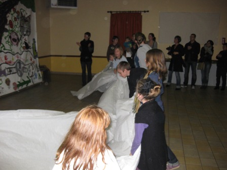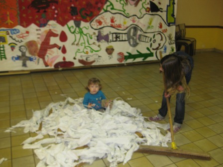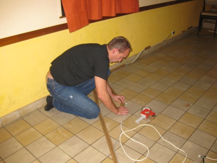 In the meantime while we, Bernard Conlon and Hatto Fischer went on a walk with Alexandra Silva was doing the last minute preparations inside the hall. Here he put tape over the cables so that no one and especially the children would stumble over them. A small but important safety precaution.