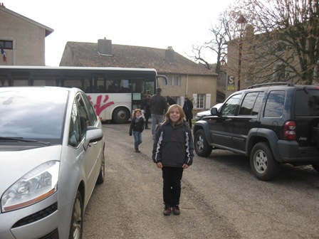 Nino, younger son of Alexandra and Silva, returning for lunch from school. The bus stop is just beside the community hall.