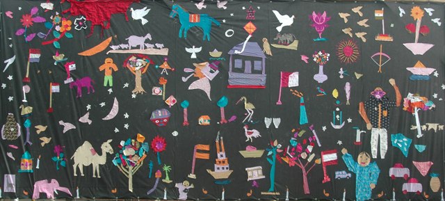 Kabul, Afghanistan mural "Never again war" which Fatema did with nearly 200 school children who had never before seen a paint brush.