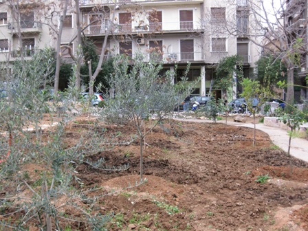 That park was build where there was before a parking place and plans existed already to have there yet another high rise office building. Once the pavement of the parking lot was torn up, they made room for the earth to plant trees, including olive trees donated by friends, neighbors and just passer-bys.