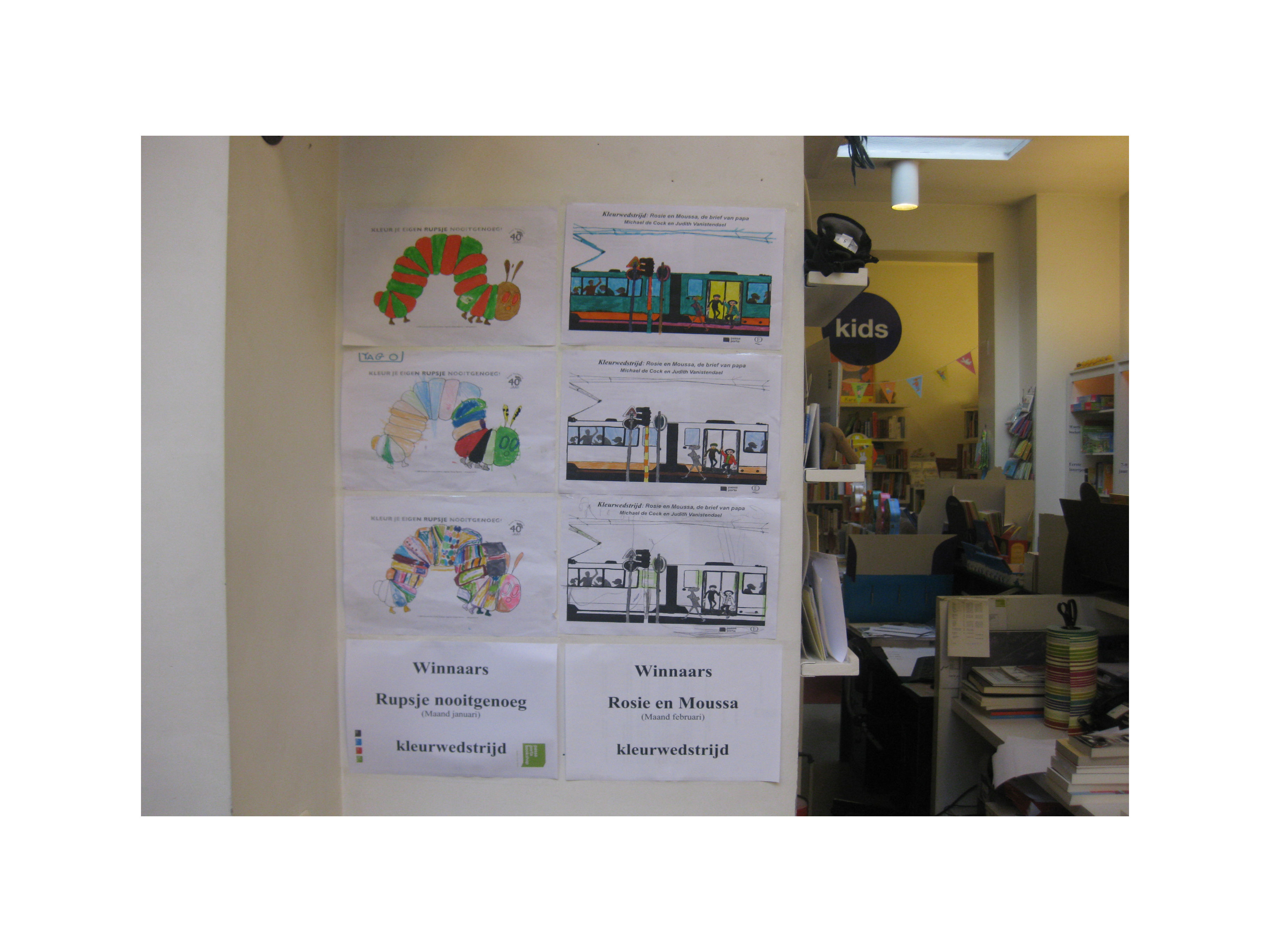 Children's corner - interesting is to see the connectivity between caterpillar and streetcar as if to suggest they move in a similar fashion forward or backward, or in association as to what artists can see in the way a streetcar dances through the streets as the case with Maria and Natalia Petschatnikov or how Vladimir Nabokov defines the streetcar as something which will vanish in near future just as did the horse drawn carriages. It is always interesting and important to see how children are drawn into the circle of avid readers despite of computers and i-pads. As long as books mean something, Passa Porta will stand for the opening to a very different world.