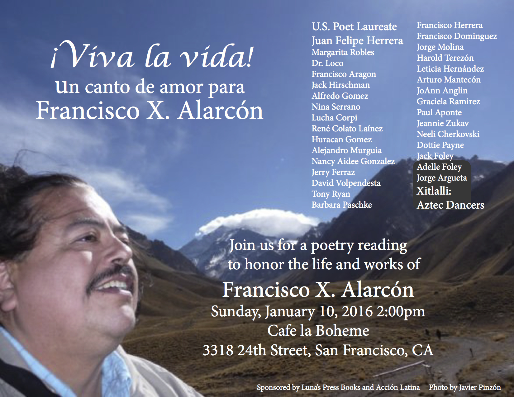 "Why am I invoking Ireland? Because one of Alarcón’s most memorable experiences as a poet was a reading tour he gave in Ireland in the early 90s to read from the Irish-language edition of Body in Flames. The poet/translator Gabriel Rosenstock came upon our Chronicle Books volume and was inspired to produce a tri-lingual version of it, relying on my English versions to render Alarcón’s signature slender poems into Irish. Jack and Adelle Foley, last Sunday at La Boheme, movingly read Rosenstock’s brief tribute to Alarcón, sent from Ireland. I’ve had the pleasure of breaking bread with Rosenstock, in Dublin, a number of times—with Francisco X. Alarcón, as always, serving, in absencia, as our puente, our bridge."