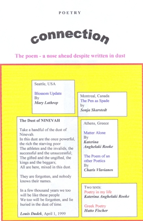 Given this connection, and it extends as well to Bernhard H. Beutler who did his Ph.D. about Dudek and introduced me to Sonja A. Skarstedt, it is most appropriate to bring this very influential lecture on imaginary poetry with a poem that shows that dust does play a key role. This can be linked later to the interpretation by Klaus Heinrich of the ancient tragedy of Antigone in his three lectures published under the title: "Das Denken und der Staub" (Thinking and Dust).